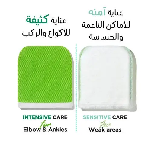 - يُستخدم الجانب الأخضر المنقوش للتخلص من خلايا الجلد الميت في المناطق العنيدة مثل الأكواع والركب والكاحلين.