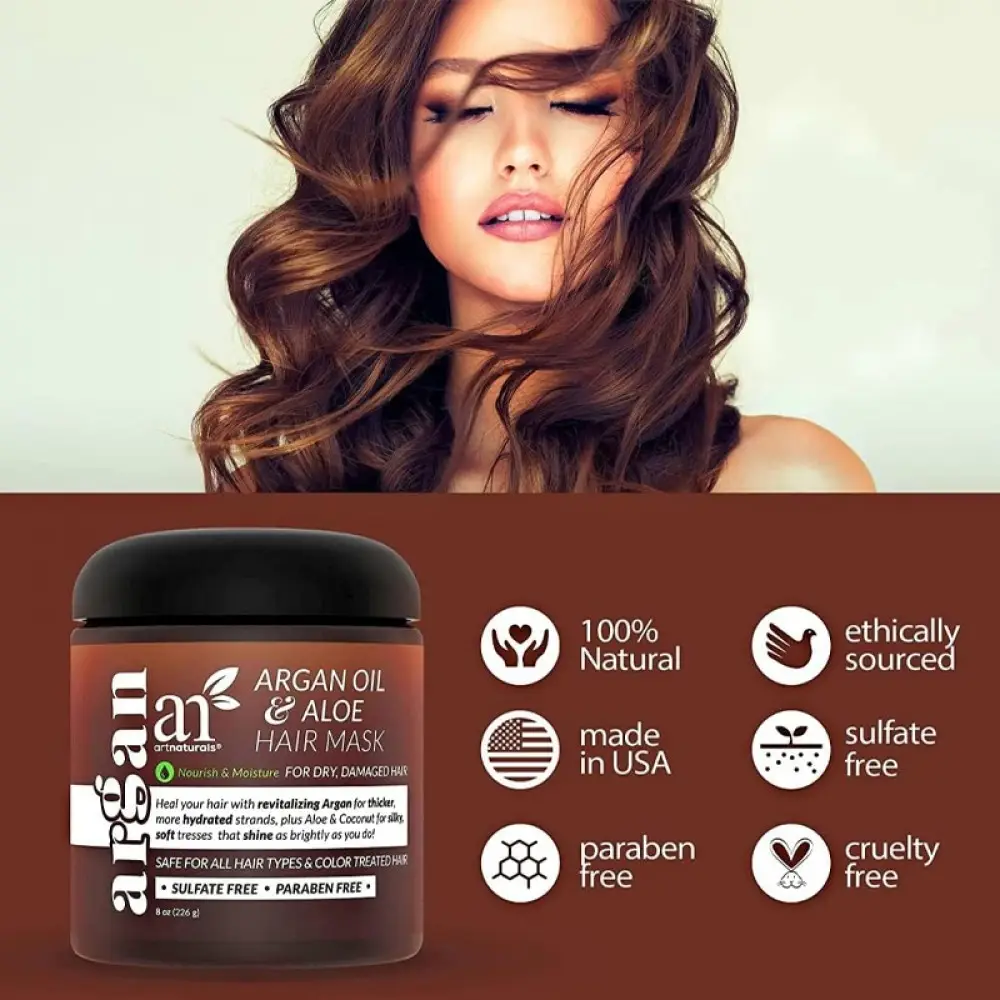 ارشادات الاستخدام:بعد غسل الشعر بشامبو وبلسم artnaturals® بزيت الأرجان، يُوضع القناع ثم يُمشط الشعر حتى يتخلله. يُترك لمدة تتراوح بين 3 و5 دقائق ثم يُشطف. بالنسبة للشعر التالف